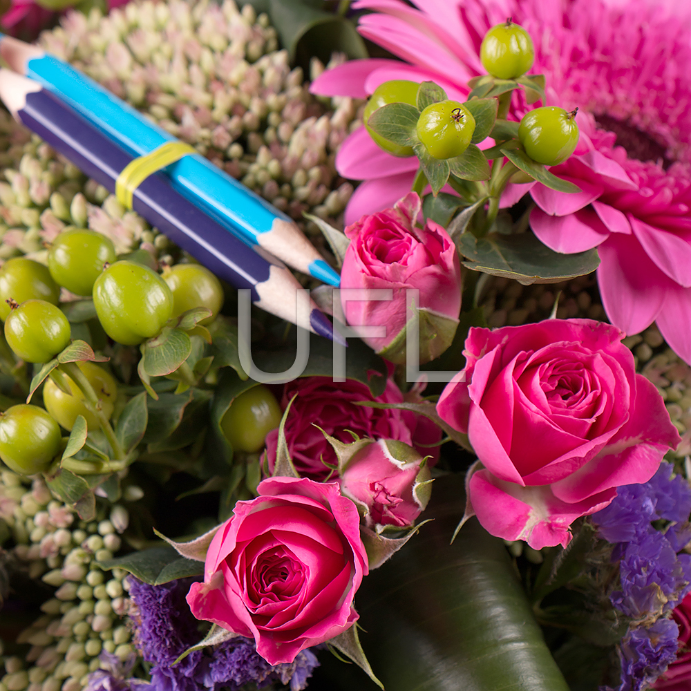 • Consist: Gerbera pink (3 pc) · Hypericum green · Roses spray pink (2 pc) · Statice blue · Packing for a flower bouquet · Tape for flowers · Sedum (4 pc) · Pencil (4 pc)