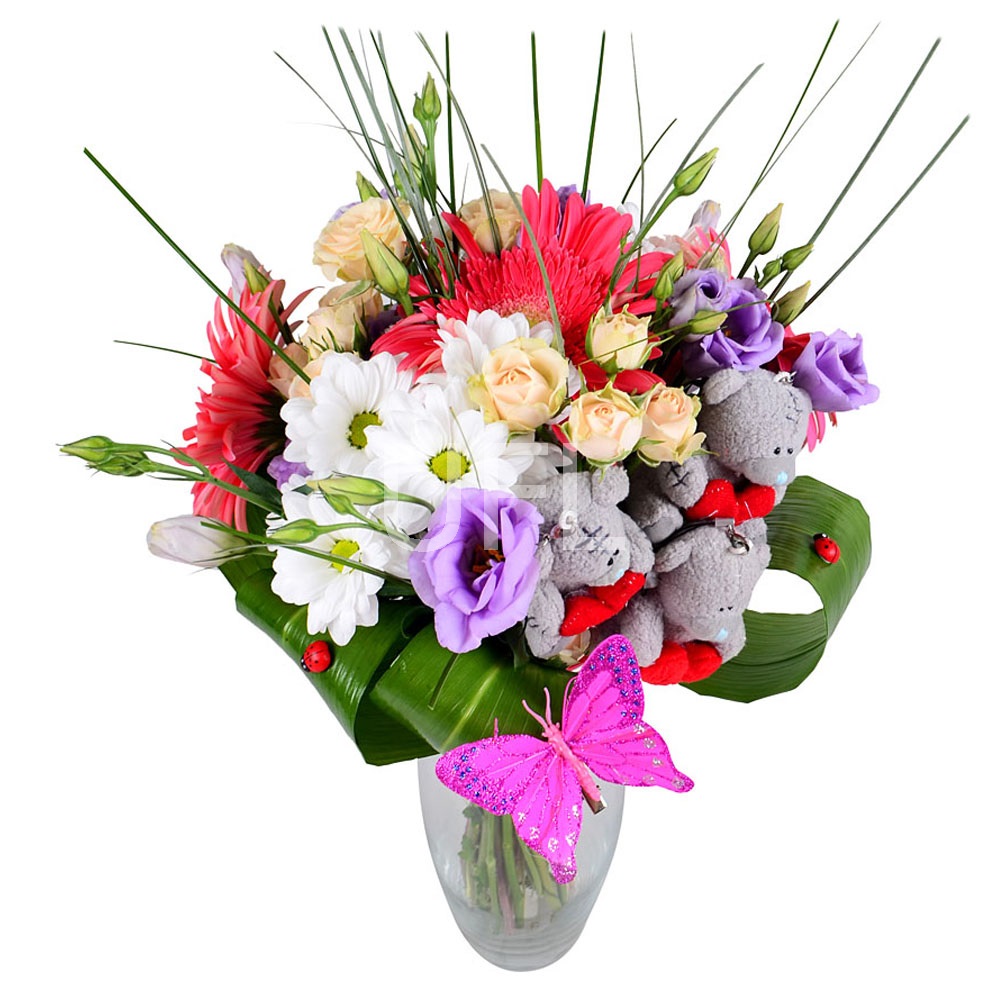 • Consist: Gerbera pink (3 pc) · Rose spray cream (2 pc) · Eustoma violet · Beargrass · Toy Teddy bear 5-10 cm (3 pc) · Butterflies decorative · Greens · Chrysanthemum spray white