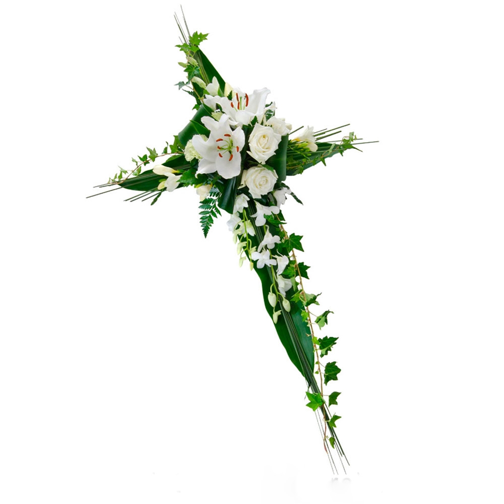 • Consist: Roses white local up to 60cm (3 pc) · Lily white · Freesia white (5 pc) · Carnation white (3 pc) · Aspidistra (8 pc) · Beargrass · Frame · Oasis (3 pc) · Greens · Dendrobium (3 pc)