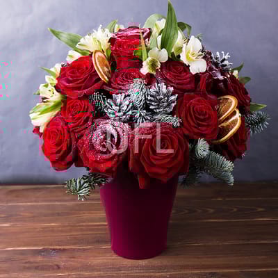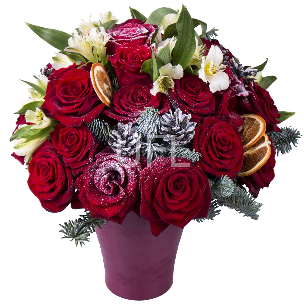 • Consist: Rose red up to 50 cm (21 pc) · Cones (5 pc) · Ornamental flowerpot S · Alstroemeria white (2 pc) · Spruce · Decorative elements · Oasis