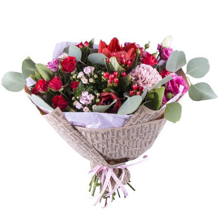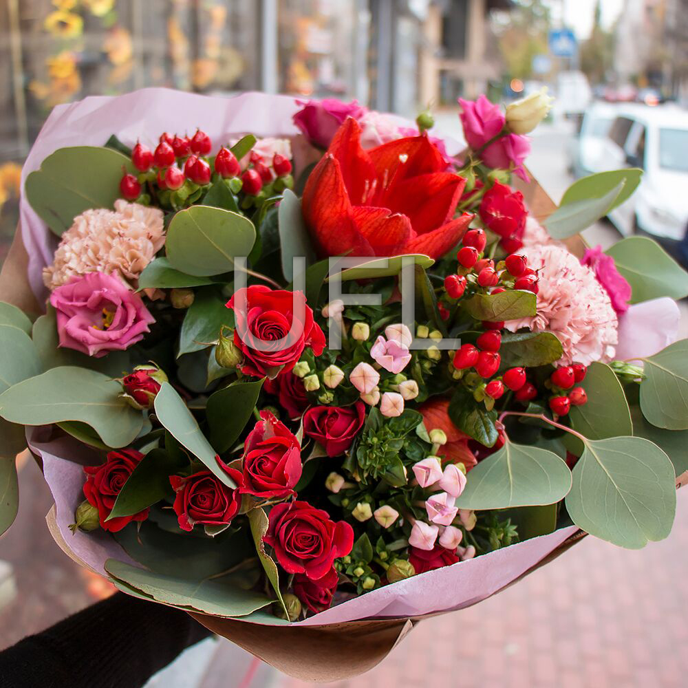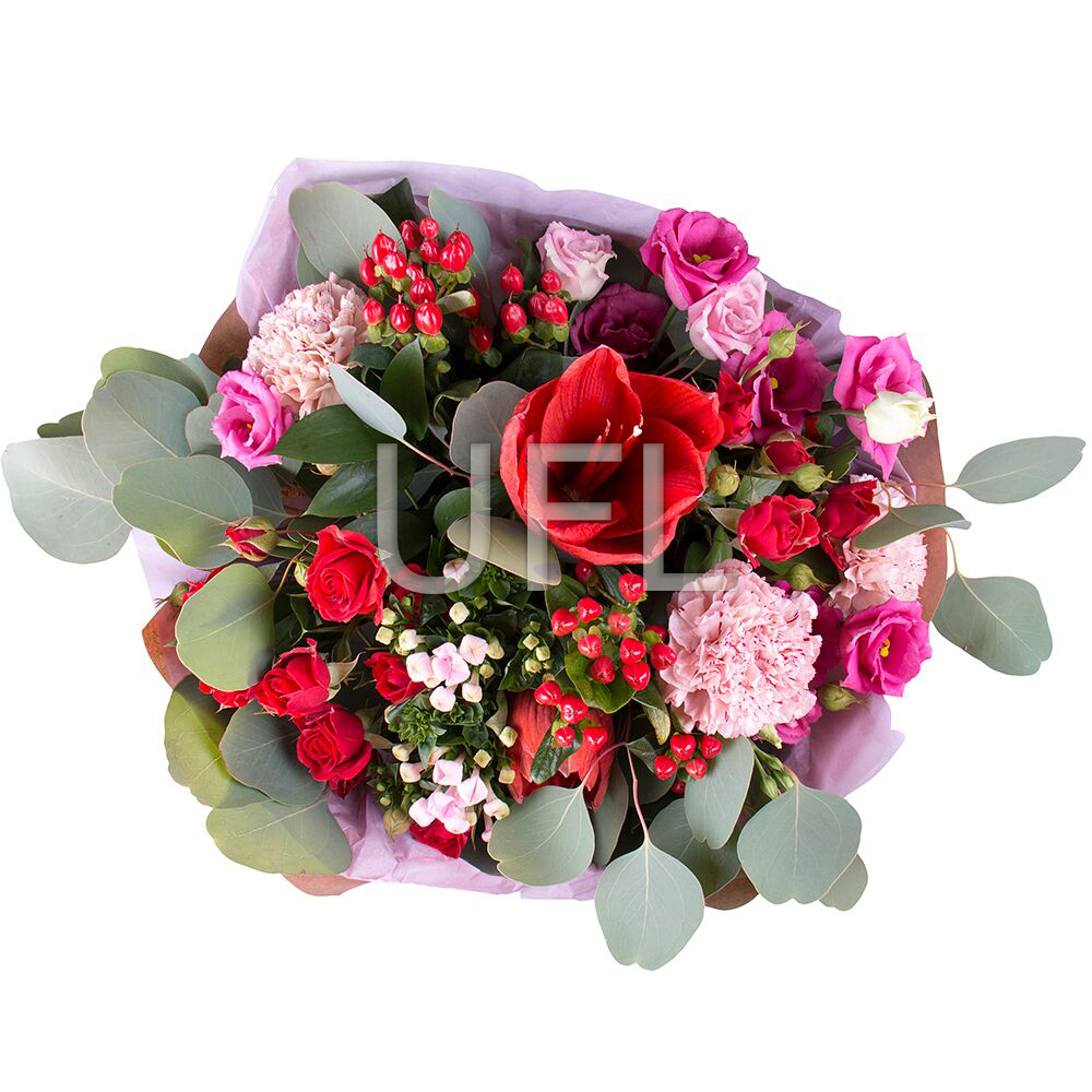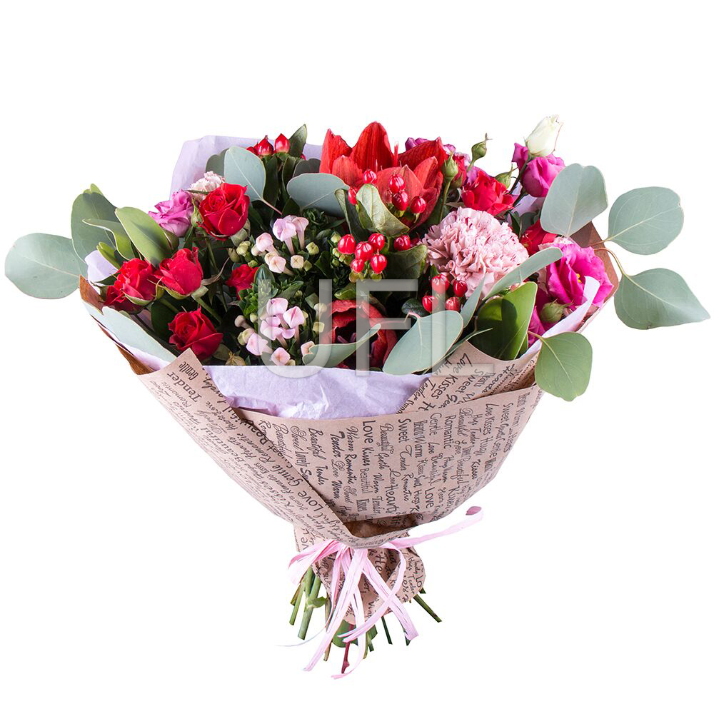 • Consist: Amaryllis red · Rose spray red (5 pc) · Eucalyptus · Packing for a flower bouquet · Tape for flowers · Bouvardia (3 pc) · Eustoma pink (3 pc) · Hypericum red (3 pc) · Carnation pink (3 pc)