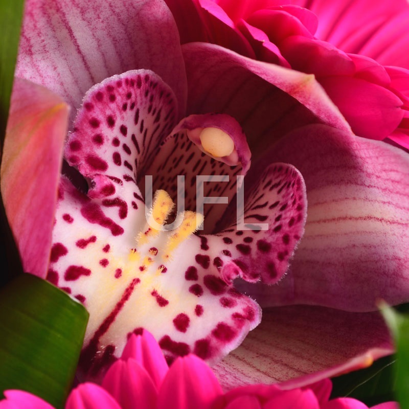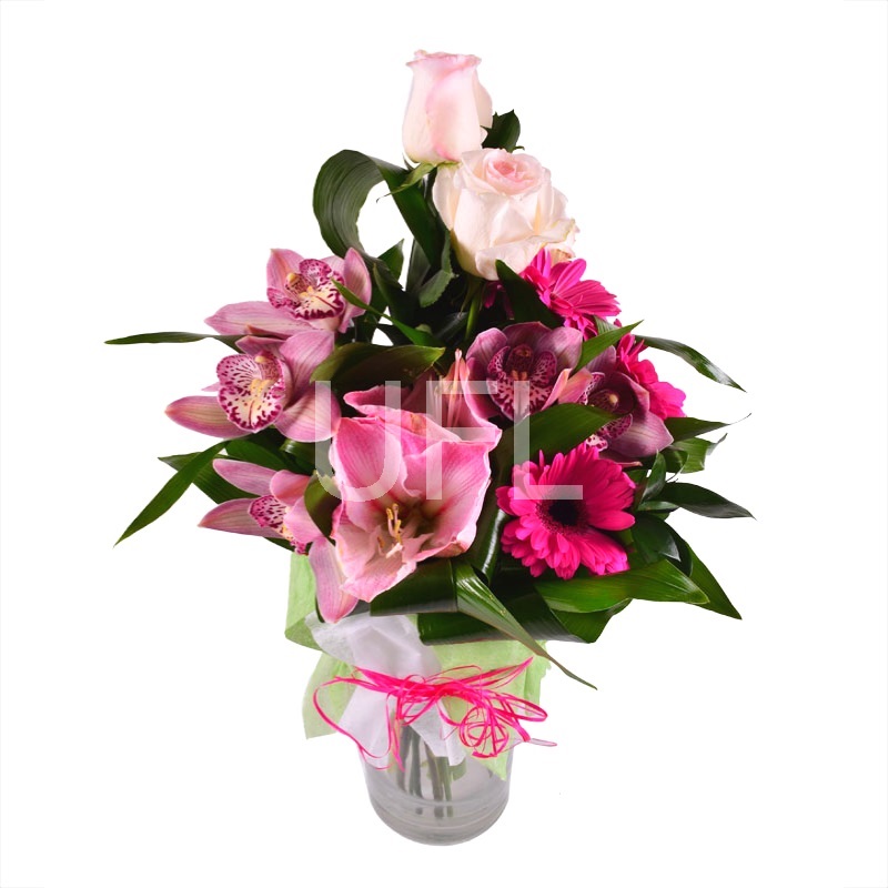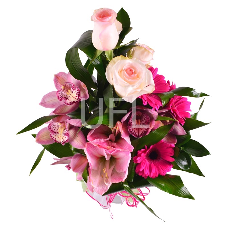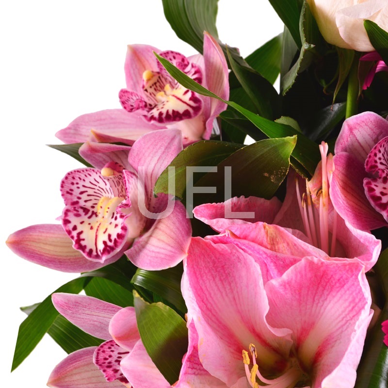 • Consist: Rose pink up to 60 sm (3 pc) · Amaryllis pink · Gerbera pink (4 pc) · Greens (2 pc) · Packing for a flower bouquet (2 pc) · Tape for flowers · Pink cymbidium orchids (5 pc)