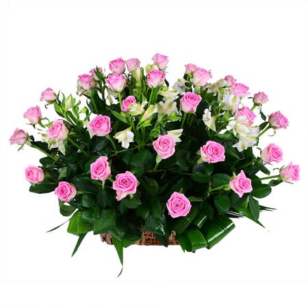 • Consist: Box M · Greens (2 pc) · Rose pink up to 60 sm (35 pc) · Alstroemeria white (6 pc) · Oasis (2 pc)