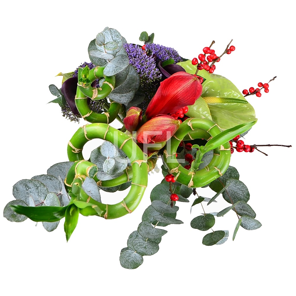 • Consist: Amaryllis red · Calla violet (5 pc) · Anthurium green, Anthurium Marysia (2 pc) · Bamboo (3 pc) · Eucalyptus (5 pc) · Tape for flowers · Trahelium purple (4 pc) · Brassica purple (2 pc) · Ilex red (4 pc)