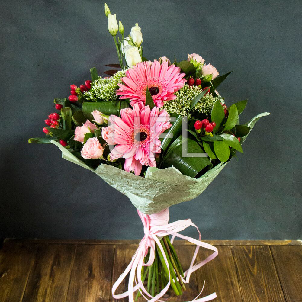 • Consist: Gerbera pink (3 pc) · Hypericum red (2 pc) · Roses spray pink (4 pc) · Eustoma white · Trahelium green (3 pc) · Greens · Packing for a flower bouquet · Tape for flowers
