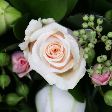• Consist: Gladiolus (4 pc) · Roses spray pink (3 pc) · Lily white (4 pc) · Rose cream 50 cm (5 pc) · Greens (3 pc) · Ruskus (20 pc) · Decorative branches (2 pc) · Tape for flowers · Oasis · Skimmia (3 pc)