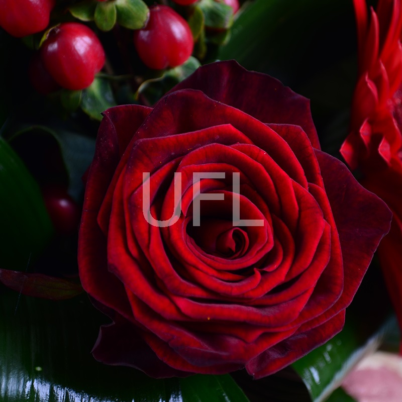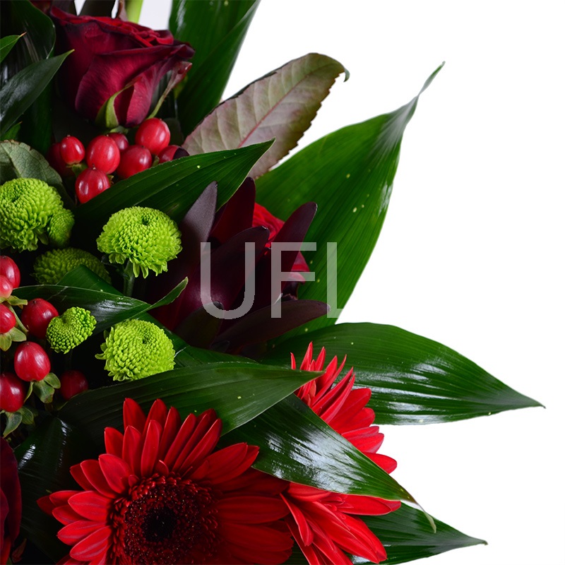 • Consist: Bamboo · Leucadendron (2 pc) · Hypericum red (2 pc) · Сhrysanthemum green (2 pc) · Gerberа red (2 pc) · Rose red up to 50 cm (7 pc) · Aspidistra (6 pc) · Packing for a flower bouquet · Tape for flowers