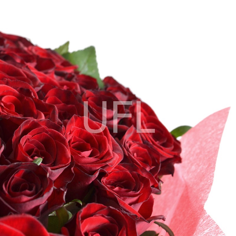 • Состав: Упаковать букет цветов (3 шт.) · Лента на цветы (3 шт.) · Роза красная до 50 см (101 шт.)