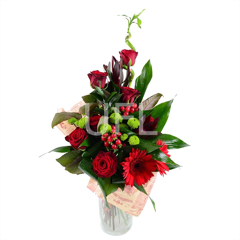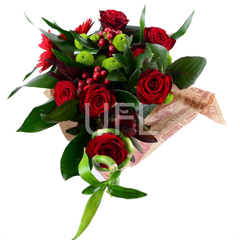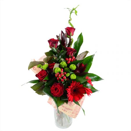 • Состав: Бамбук · Леукодендрон (2 шт.) · Гиперикум красный (2 шт.) · Хризантема зелёная (2 шт.) · Гербера красная (2 шт.) · Роза красная до 50 см (7 шт.) · Аспидистра (6 шт.) · Упаковать букет цветов · Лента на цветы