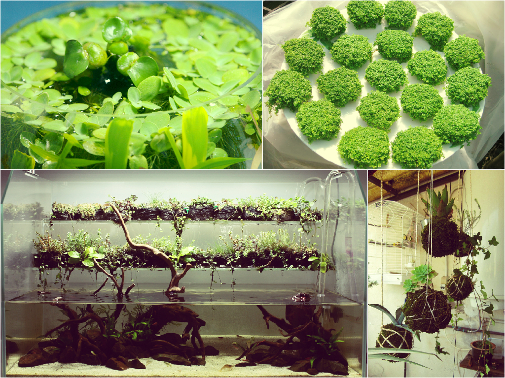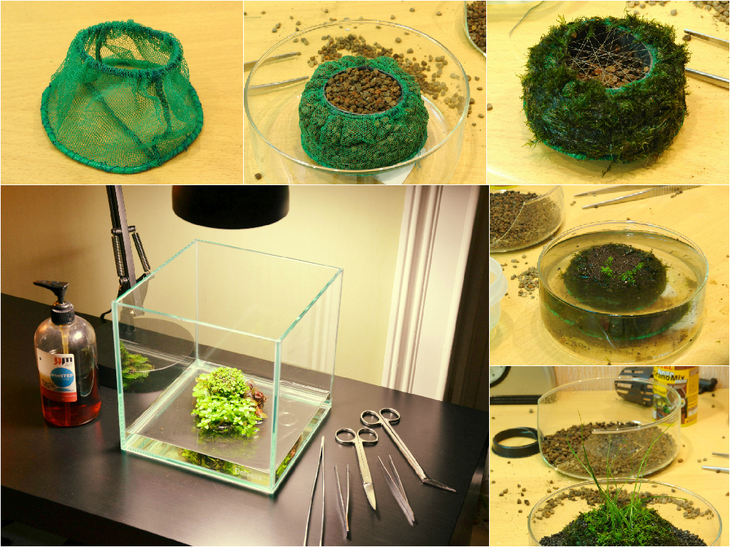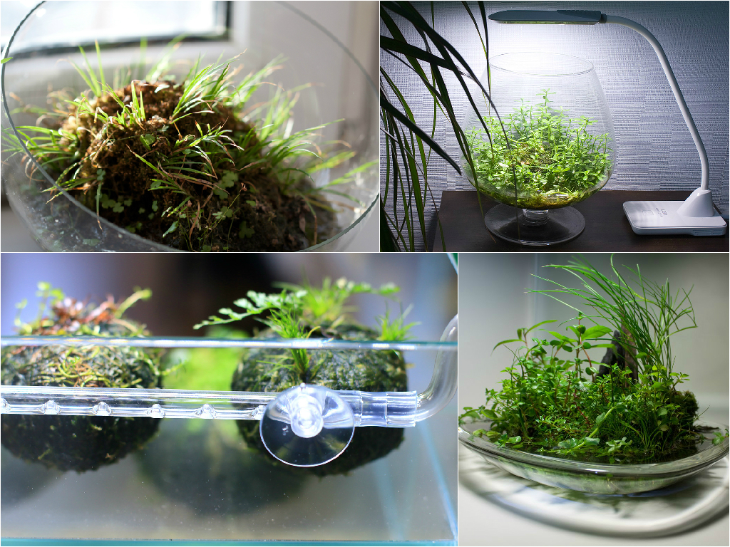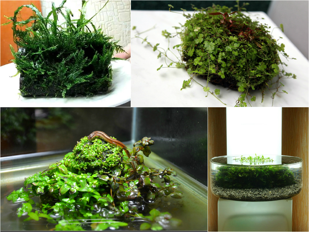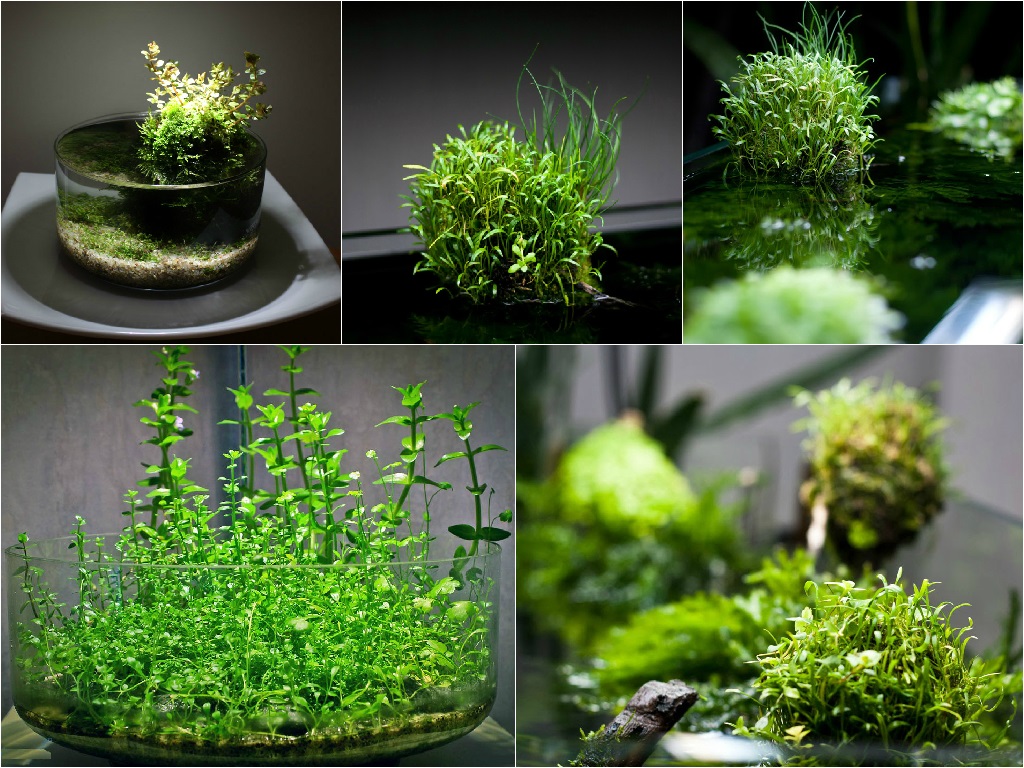 To create the Wabi-Kusa it is not necessary to use the aquarium, which is only for fishes. The plants will look very well in low vases and bowls made of glass. The main features of Wabi-Kusa are special moss hummocks, to which aquatic plants grow, forming an unusual composition. The substrate for these earthen balls is easy enough to create by yourself. It is enough to mix clay with shallow haydite and a small amount of charcoal. Thus, you should get a mixture of dense and elastic. Then you should blind small balls of the ground and then wrap them with moss (or example, with kladofora or Javanese) using transparent thread or fishing line.