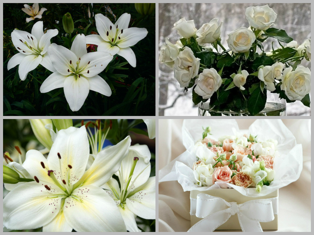 • белый цвет – это, помимо прочего, воздушность и легкость. То, что неизменно улучшает настроение – как белые облака, свежезастеленная постель, сахарная вата, хлопья снега, конфетти, ароматная пена, да мало ли на свете таких вещей! От одних мыслей о них хочется улыбаться, и белый букет цветов в данном случае – не исключение. Каждый, кому вы сделаете такой подарок, будет чувствовать себя по-детски счастливым;