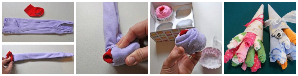 • если Вы хотите сделать бутон из детской шапочки, схема практически такая же. Один край лучше подогнуть, чтобы верх цветка был ровным. Далее скатываем шапочку в рулончик и отгибаем края так же, как и в случае с носочком;