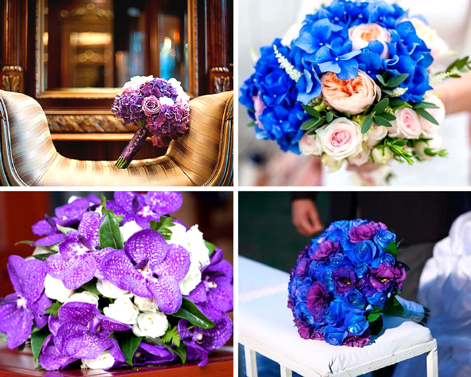 Доминирующие синие или фиолетовые цветы лучше оттенить белыми бутонами, а не зеленью, на фоне которой «главные герои» совсем потеряются. Кроме того, этот же универсальный цвет придет на помощь, если в букете «столкнутся» не очень хорошо сочетающиеся между собой цвета: он улучшит общее впечатление. Однако слишком увлекаться белым не стоит: он способен «оттянуть» на себя все внимание.