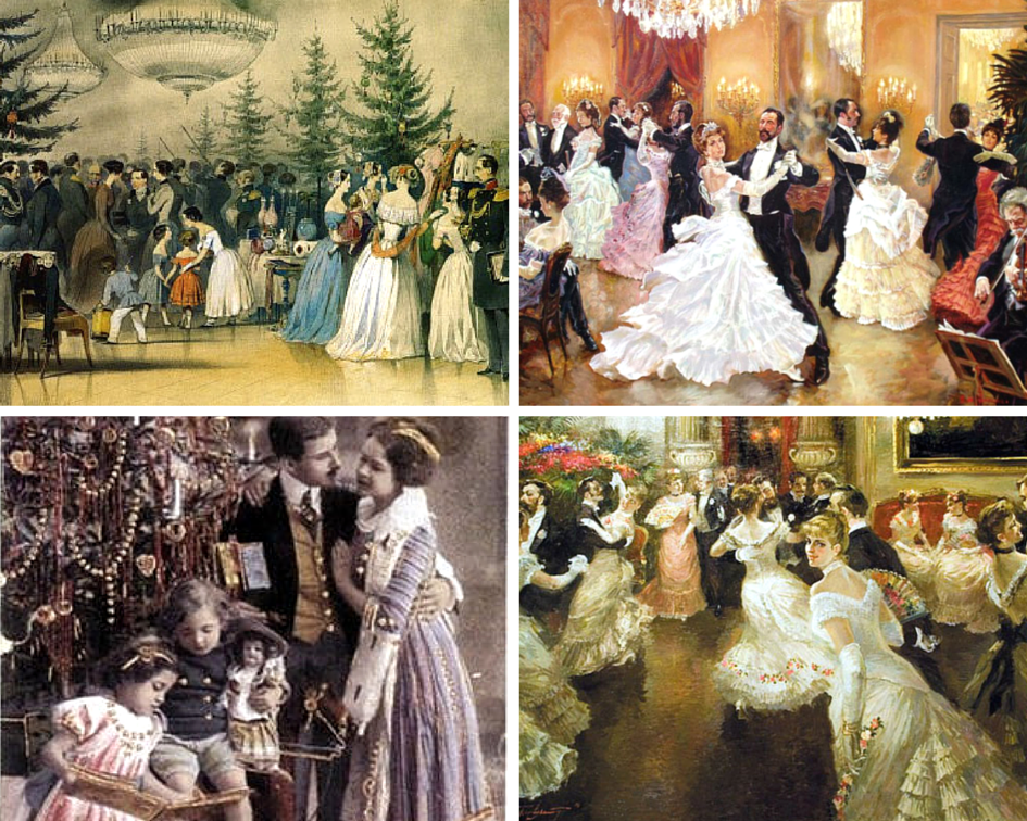 До середины XIX века Новый год отмечали без богатого застолья, ведь главным был праздничный бал. Стол накрывали очень просто даже в домах знати. Чаще всего в меню присутствовали соления, грибы, салат из редьки, отварная в вине форель, жареный поросенок, телячье фрикасе. Как правило, подавали также свежие фрукты: абрикосы, виноград, груши, и даже, апельсины. Зимой их выращивали в оранжереях Петербурга и Москвы, которые тогда вошли в моду.