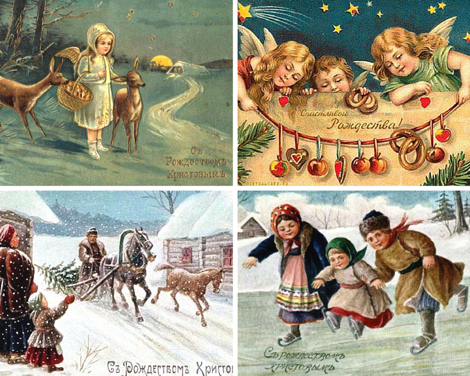 Дореволюционные российские открытки своей красотой не уступали иностранным. Так как в то время, Рождество отмечалось 25 декабря – яркие карточки служили также поздравлением с Новым годом. Тематика открыток была самая разнообразная: в них были мотивы природы, сказок, и даже отображались разные события, в том числе и Первая мировая война. После революции отечественные открытки выпускали только на новогоднюю тематику. Отмечать религиозный праздник – Рождество в то время было запрещено.
