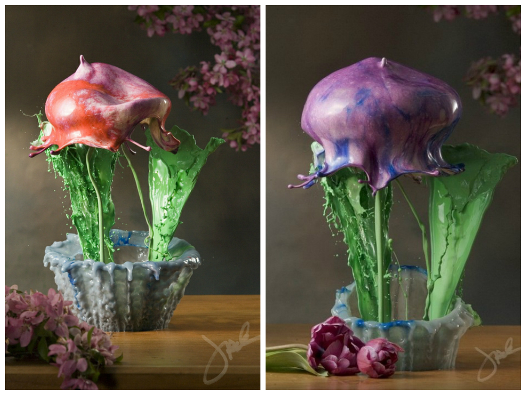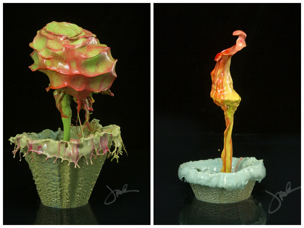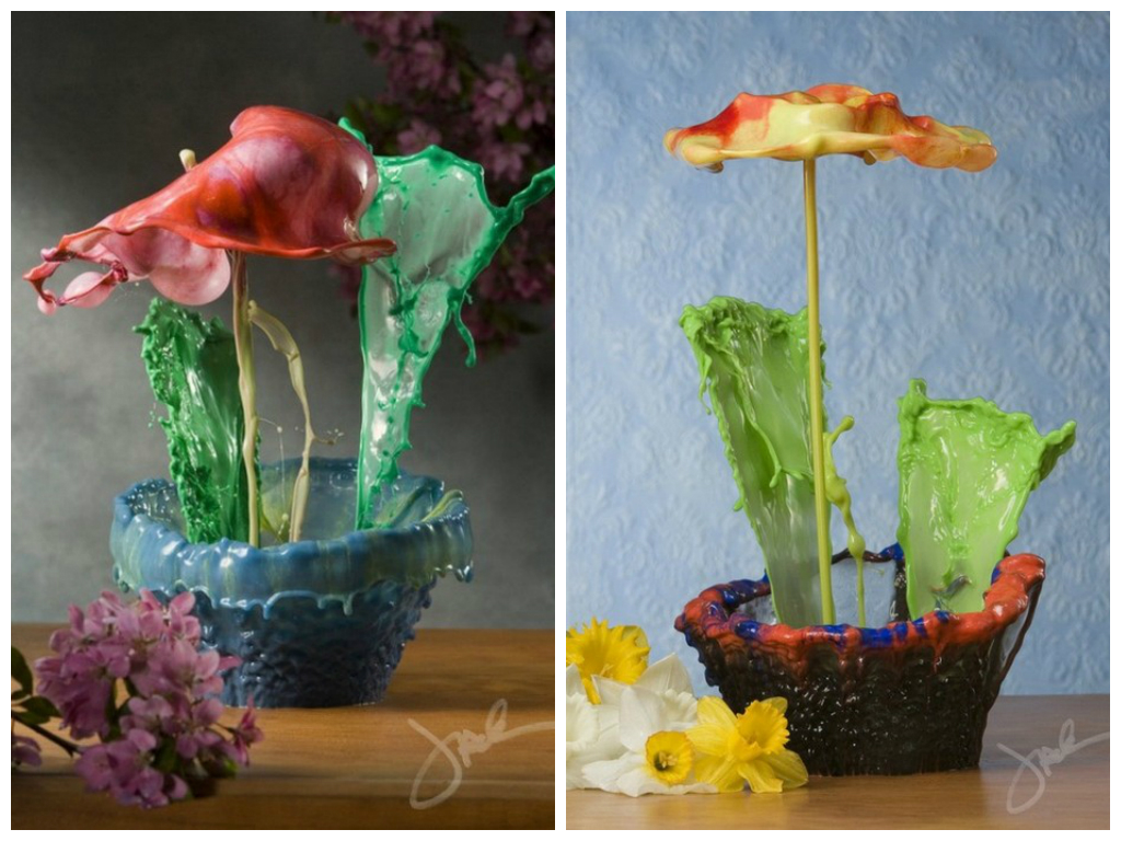 Джек Лонг – американский фотограф, который творит при помощи высокоскоростной съемки и обычной подкрашенной воды. Фотографии получаются такими необыкновенными, что сложно представить, что это не творение графических редакторов! Автор не раз заявлял, что он никогда не использовал фотошоп, и все, что мы видим – это одна экспозиция. Джек Лонг умело рассчитывает тот момент, когда капля подкрашенной акрилом воды разбивается о различные поверхности.