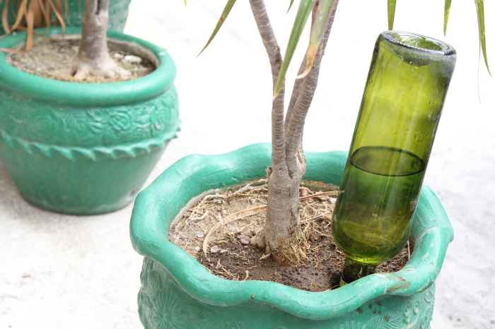 Способ № 2. «Волшебная» пластиковая бутылка. Перед отъездом хорошенько полейте цветы. Затем возьмите обычную пластиковую бутылку с крышкой, сделайте в ней два маленьких отверстия на дне и в крышке (например, шилом или спицей). Наполните её водой, переверните и вставьте в вазон. Жидкость будет постепенно вытекать из бутылки, насыщая землю драгоценной влагой.
