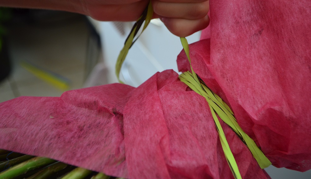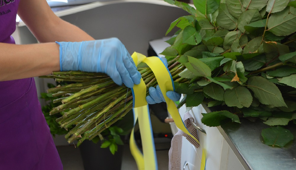Когда Ваш букет в центре пересечения стеблей станет сложно удерживать одной рукой, возьмите флористическую ленту и плотно свяжите цветы в том месте, где вы их держали. Пусть лента несколько раз огибает букет – крепление должно быть надежным и плотным.