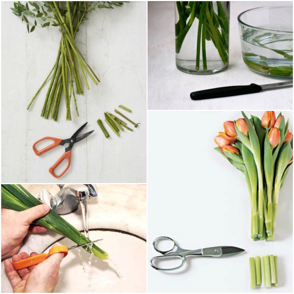 • сами стебли также нужно обрезать наискосок под струей воды – она должна быть прохладной, но не ледяной. Если на кухне нет достаточно острых ножниц, подойдут канцелярские;