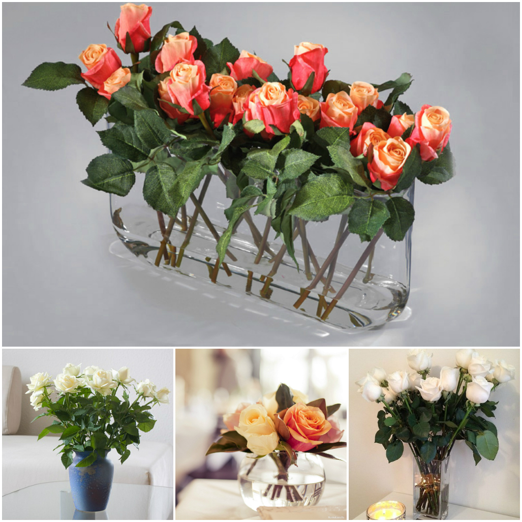 Благородные розы также требуют особого, индивидуального ухода. Как и в случае с другими растениями, конец стебля также необходимо обрезать под углом, при этом срез должен иметь как можно большую площадь. Для лучшего проникновения воды стебель расщепляют. Делать это предпочтительно под водой, чтобы воздушные пузырьки не попадали в стебель и не препятствовали доступу воды.
