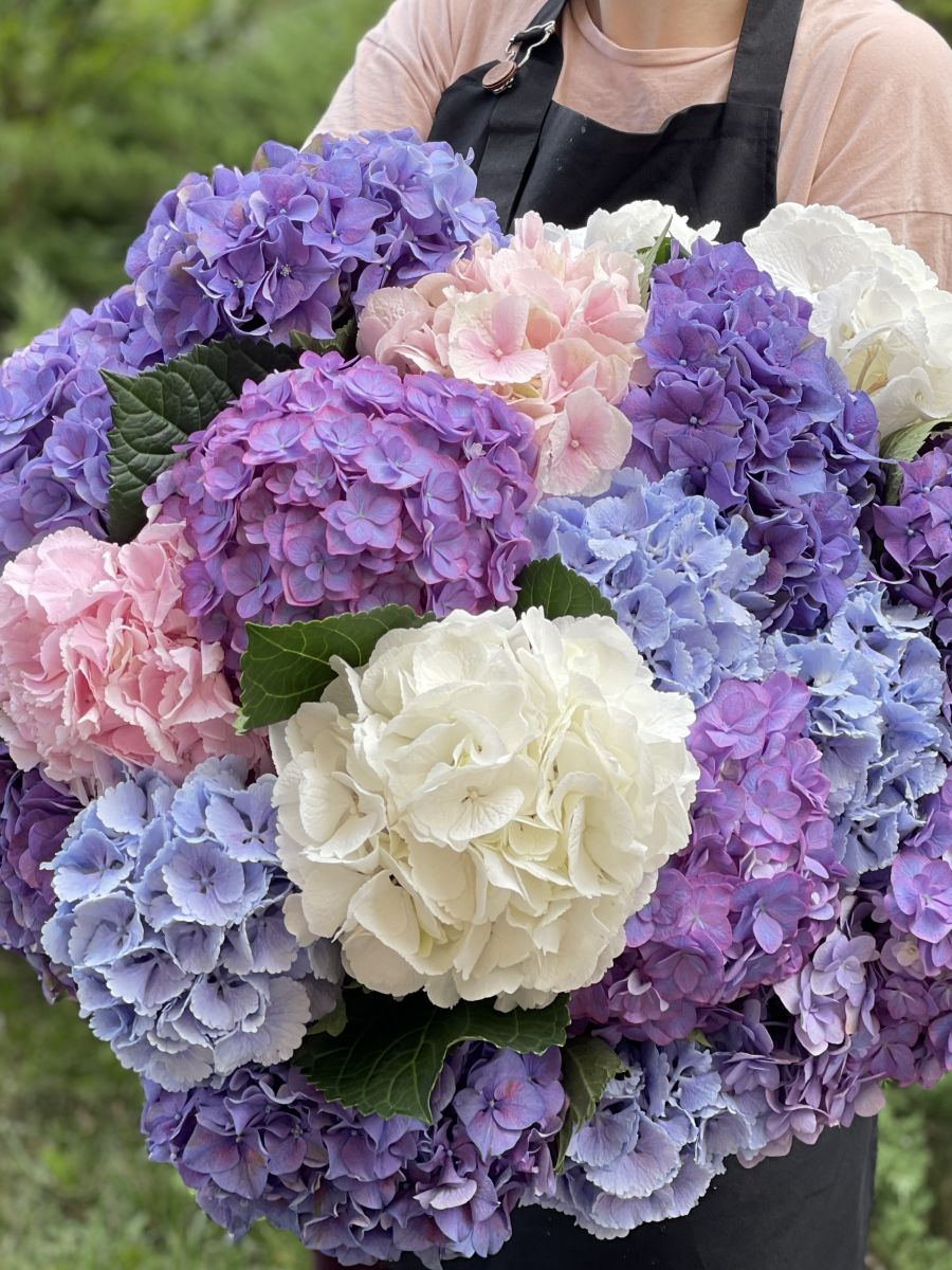 Обратите внимание: Эффектно выглядят как монобукеты из гортензий, так и композиции с этим цветом в сочетании с пионами, розами, дельфиниумом и каллами.