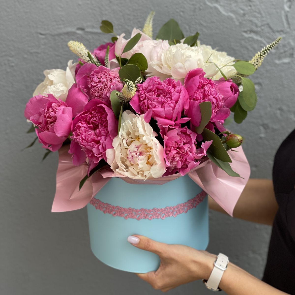- Шляпные коробки. Скомпонованные из 2-3 видов пионов композиции выглядят эффектно и необычно. Коробку можно дополнительно украсить бантом, лентами и стразами. Хороший подарок на день рождения.