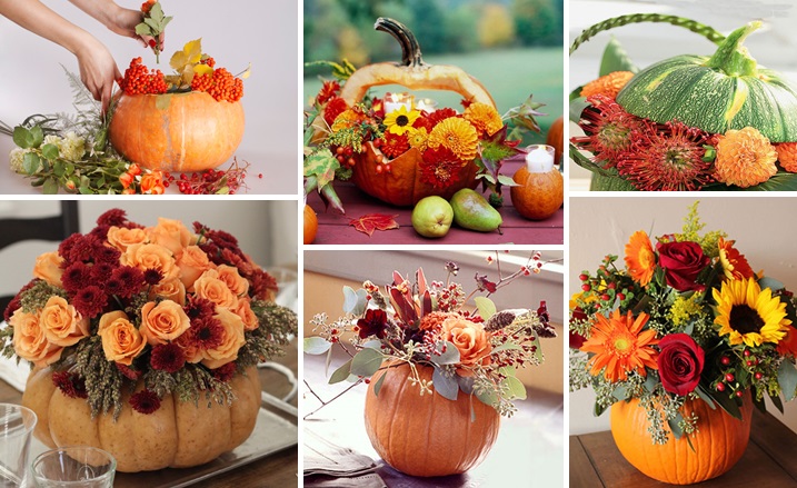 Срежьте верхушку тыквы, извлеките из корки мякоть, разместите в получившемся углублении флористический оазис – и дайте волю фантазии! Наполните ее цветами, листьями, зеленью, декоративными ветками... Совершенно не обязательно обладать навыками флориста, чтобы составить безумно красивый букет!
