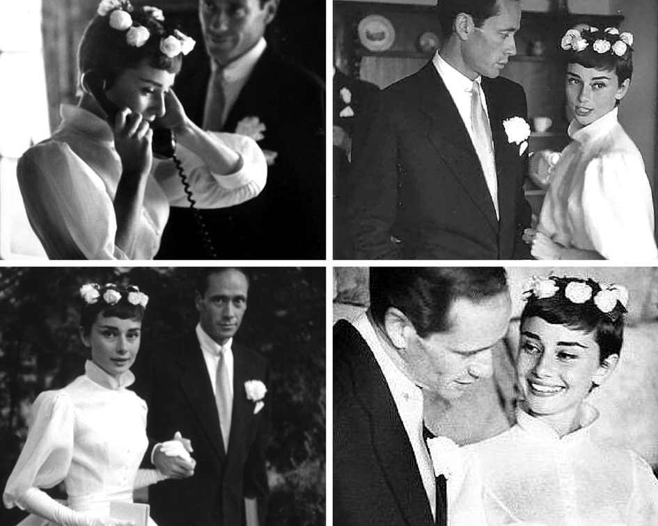 Для своей первой свадьбы с актером Мэллом Феррером Одри Хепберн сама украсила часовню, в которой проходило венчание, ландышами и белыми гвоздиками. Цветы также присутствовали в образе самой невесты. Венок из живых розочек гармонично дополнял элегантное белое свадебное платье с шифоновыми рукавами. Наряд был создан дизайнером Юбером Живанши специально для Одри – утонченной женщины, которая была его музой. В качестве обуви актриса выбрала балетки, которые вошли в моду именно благодаря ей.