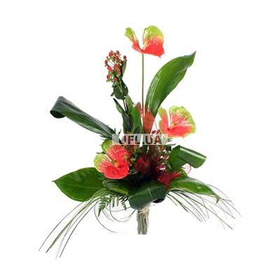 Классический подарок для мужчины несколько, необычно сложенных крупных цветков, на длинных стеблях. Это такие цветы как, антуриумы, амариллисы, или каллы.