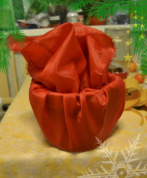 1. Берем горшок и декорируем его по своему вкусу на новогоднюю тематику. Можно просто обернуть его в подарочную бумагу или ткань, а можно разрисовать красками, обклеить гирляндой или шнурочком. Как самостоятельно сделать горшок, мы уже рассказывали Вам в статье «Ваза из цветов своими руками». Если у Вас есть готовый подходящий сосуд, тогда приступаем сразу ко второму этапу.