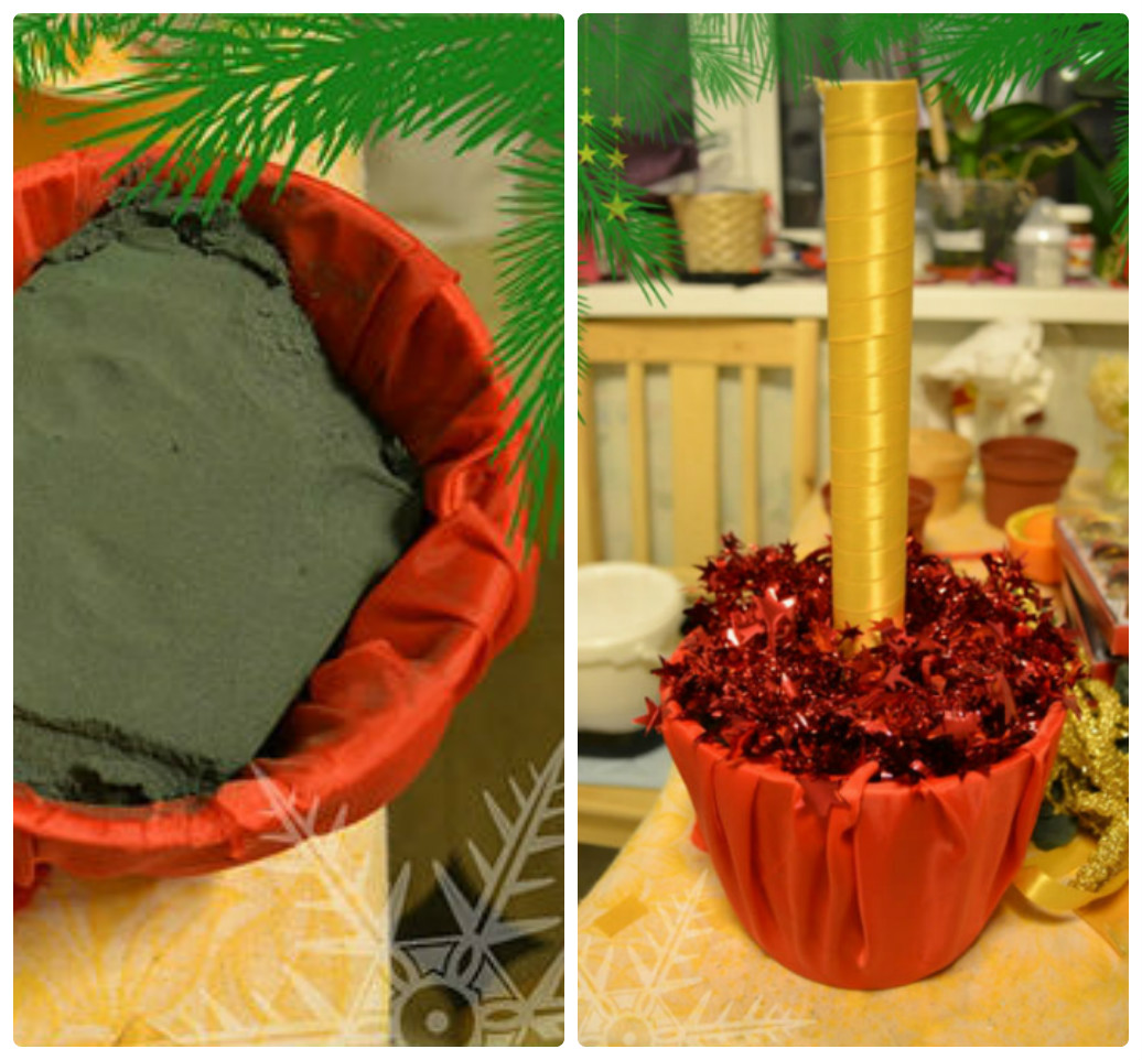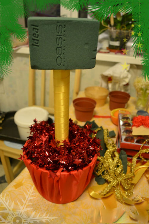 2. Внутрь нашего горшка кладем пенопласт или оазис, обрезав его по краям, и хорошо закрепляем посредине ствол будущего дерева. В качестве ствола подойдет толстая ветка или любая другая палка, а также картонная основа, обмотанная лентой. Чтобы оазис не был виден в горшке, сверху можно положить дождик, гирлянду, серпантин и т.д.