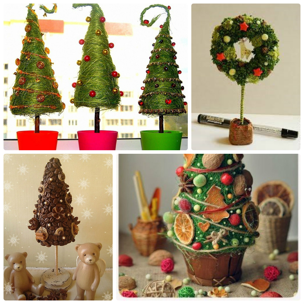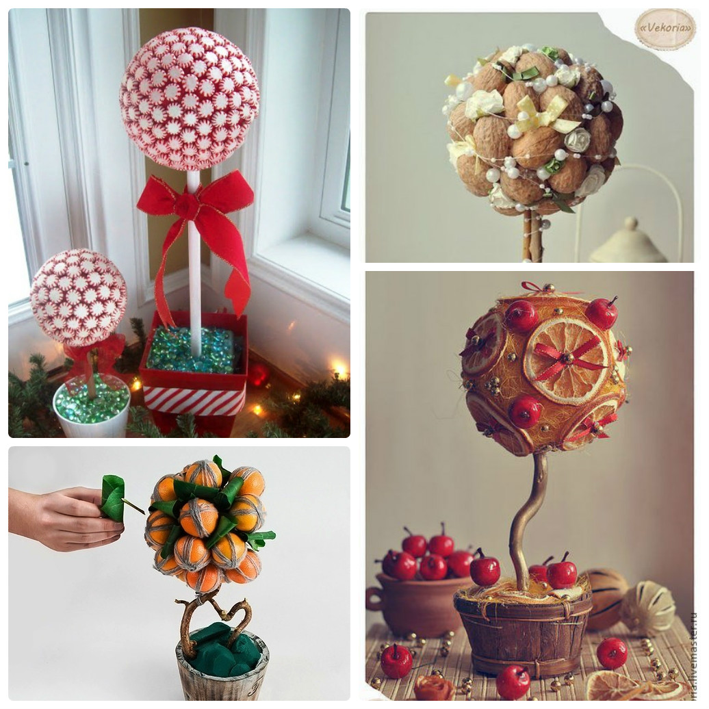 Для создания дерева счастья можно использовать самые различные материалы, большинство из которых всегда под рукой. Это и декоративная цветочная бумага, и салфетки, и сладости, и разноцветные пуговки, и много чего другого. Топиарии, созданы специально к Новому году, могут быть: