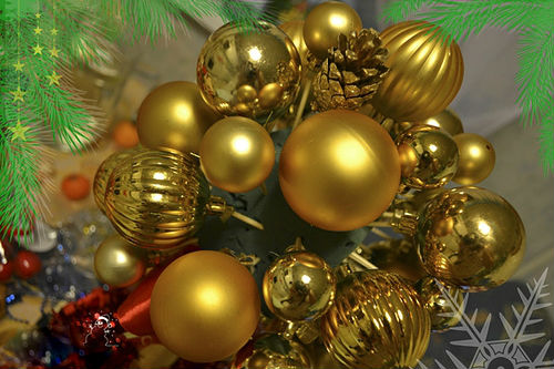 4. Шарики (лучше всего, пластмассовые - они легче и не бьются) приклеиваем к зубочисткам и вставляем в шар-основу в свободном порядке. Игрушками поменьше и остальными элементами декора заполняем пробелы между крупными шарами. При этом не забываем параллельно формировать круглую форму.