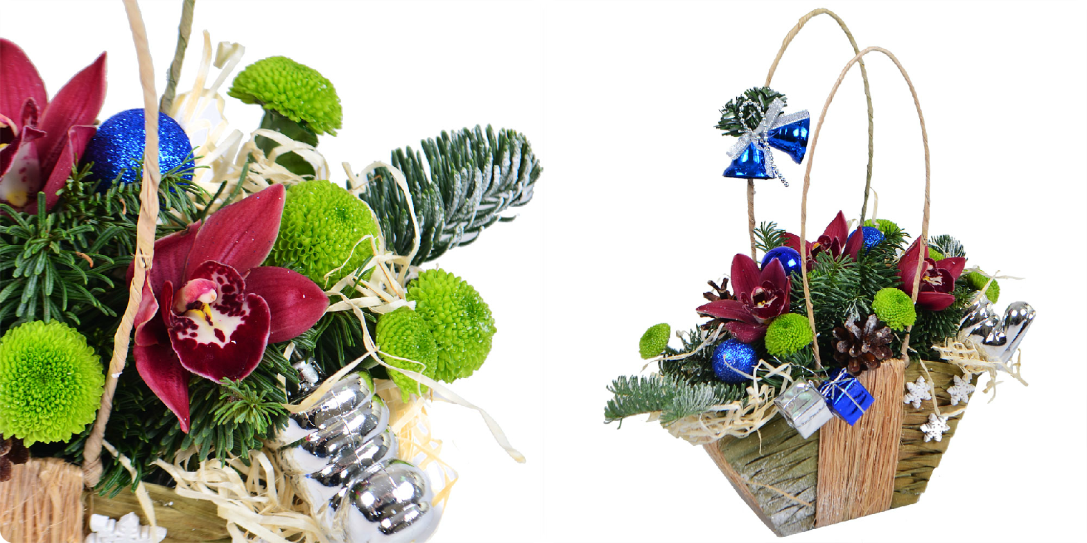1. Композиции в плетеных корзинках с тематическим декором из еловых веточек, игрушек, мишуры, шишек;