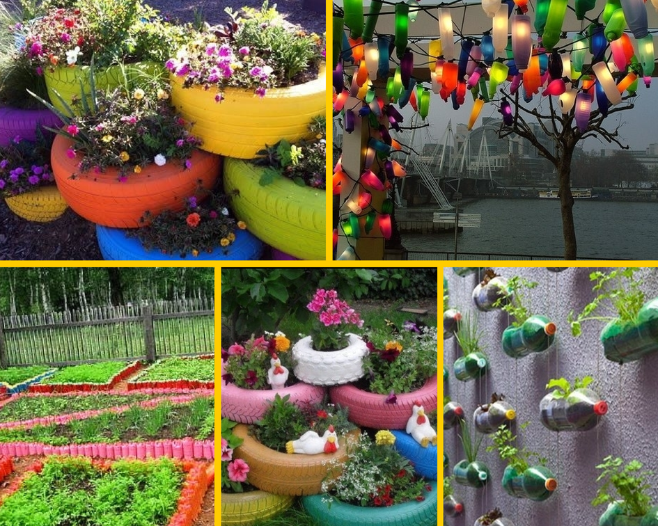 • Ярко окрашенные пластиковые бутылки, фигурно обрезанные по краям, станут отличными декоративными горшками для уличных цветов.