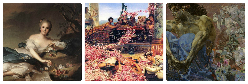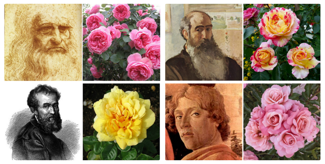 Можно также разделить по группам сортов, которые являются наиболее популярными среди селекционеров-почитателей искусства. Например, к группе сортов роз флорибунда относятся роза «Боттичелли», названная в честь флорентийского художника и роза «Камиль Писсарро» (французский художник-импрессионист). А к группе чайно-гибридных сортов роз относятся, например, роза «Альбрехт Дюрер» (великий немецкий живописец), роза «Клод Моне» (французский художник-импрессионист), роза «Микеланджело» (в честь великого итальянского скульптора и живописца эпохи Возрождения Микеланджело Буонарроти).