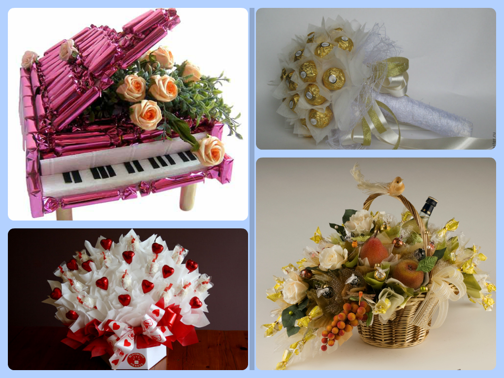 Изготовление сладких букетов своими руками – увлекательное творческое занятие. С Вашей помощью самые простые композиции из сладостей сможет сделать даже ребенок. Для него процесс превратится в интересную игру, а результат – в оригинальный подарок. Конечно, купить сладкие букеты – не проблема. Но куда интереснее сделать их своими руками!