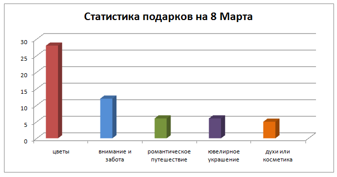 К Международному женскому дню продажи цветов вырастают в половину. Интересно, что по результатам анонимных опросов значительная часть женщин хочет получать на 8 Марта именно цветы, отдав им предпочтение перед романтическим путешествием, украшениями, косметикой. Даже пункт "тепло и забота" отмечен гораздо меньше раз, возможно потому, что подарить цветы - и значит проявить заботу по отношению к любимой женщине.
