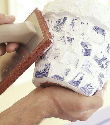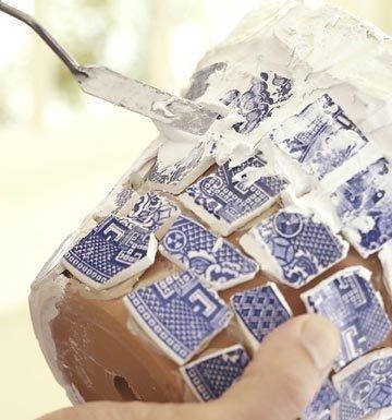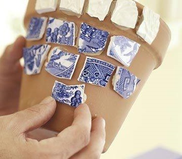 Добиваем остатки пострадавшей посуды. Делаем это аккуратно, стараясь, чтобы черепки получались приблизительно одинакового размера, и приклеиваем к имеющемуся горшку сомнительной внешности, которую мы и беремся, собственно, исправить.