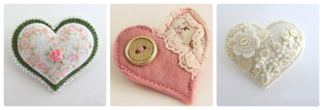 Если такая фетровая валентинка далась Вам легко, то попробуйте сделать более сложный вариант. Сердечко можно сделать многослойным или состоящим из двух половинок, украсить его бисером или бусинами, пуговками, кружевами, лентами. Вот несколько идей для вдохновения: