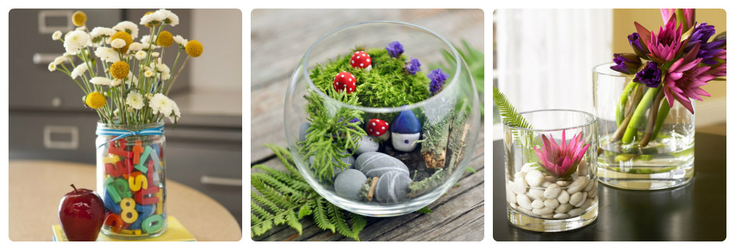 Самый простой и быстрый способ добавить сосуду для цветов оригинальности, это положить внутрь какие-либо декоративные элементы. Это могут быть морские ракушки и камушки, деревянные буквы и цифры, бусы или отдельные перламутровые бусинки, кофе или разные крупы. Такая ваза, кроме своих основных обязанностей, послужит прекрасным элементом домашнего декора. Кстати, вместо прозрачной вазы можно взять обычную двухлитровую банку, высокий стакан или чашку для маленьких цветов.