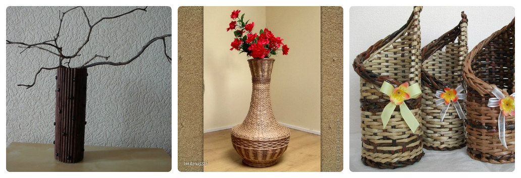 Не спешите выкидывать собравшуюся дома макулатуру, ведь из нее можно сделать прекрасную вазу своими руками. От Вас не потребуется много времени или усилий, а работа при этом окажется увлекательной и интересной. Итак, берем ненужные журналы (газеты, тетрадки, книги) и скручиваем трубочки из страниц. Чем длиннее получится трубочка, тем лучше. Толщину выбираете сами, можно крутить трубочку из четверти страницы, из половины или из целой. Сделав нужное количество (около 100 шт.), приклеиваем их к основе, которой может служить пластмассовая бутылка, скрученный ватман, тубус или, опять таки, старая ваза. Далее проделываем все то же самое, что и с вазой из карандашей. Когда освоите этот способ плетения вазочек из газетных трубок, можете переходить к более сложному - плетению спиралью.