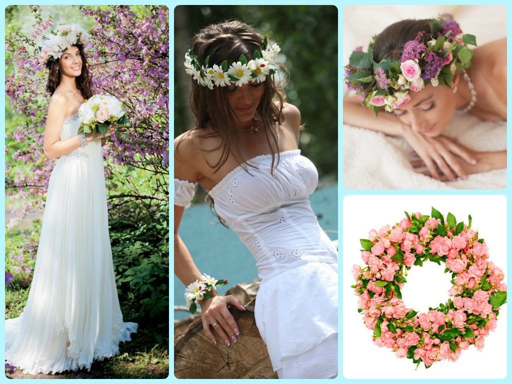 К классическому пышному или зауженному платью хорошо подойдет сдержанная, аккуратная композиция, состоящий практически из одних цветов. Если платье свободное, разлетающееся, то небрежный венок с вплетенными веточками и травинками превратит невесту в очаровательную лесную фею.