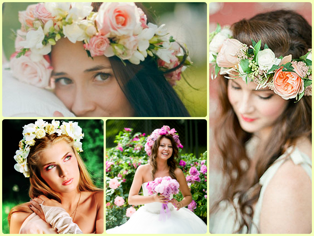 Чем светлее волосы и глаза у невесты, тем светлее и нежнее должен быть венок. Полевые цветы позволят создать романтичный и утонченный образ. Если волосы темные, то оттенки лепестков должны быть ярче, контрастнее. Один или несколько крупных ярких цветков привлекут к себе внимание, добавят загадочности и изысканности.
