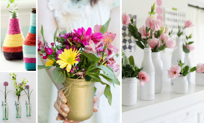 Безусловно, предусмотреть все на свете нельзя. И если вдруг вам преподнесли букет, для которого в доме не нашлось подходящей вазы, можно воспользоваться любой другой емкостью – и собственной фантазией!Достаточно обмотать обычную бутылку или банку тканью, цветной бумагой или упаковочной сеткой для цветов, перетянуть контрастной лентой – и в Вашем распоряжении уникальная, красивая ваза, сделанная своими руками. Простое и оригинальное решение!