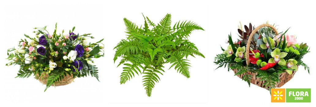 Декоративные листья папоротника, которых существует множество видов, очень часто заполняют свободное пространство букета. Располагаясь по периметру, папоротник делает любой букет эффектным и дорогим. Его узорчатые ветки темно-зеленого цвета создают прекрасный фон для изящных бутонов.