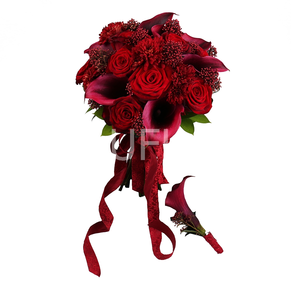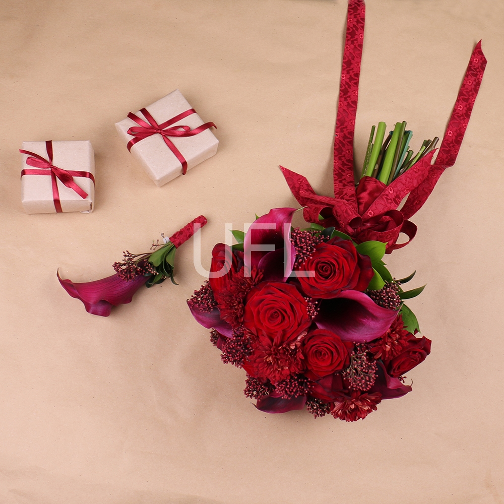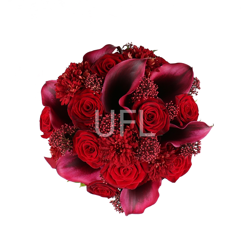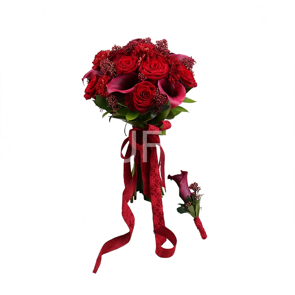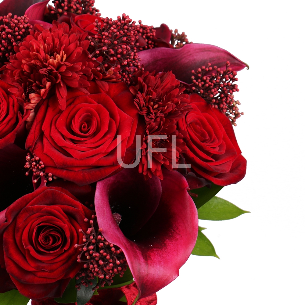 • Состав: Роза красная до 50 см (9 шт.) · Калла бордовая (7 шт.) · Скиммия · Зелень в букет · Лента на цветы (3 шт.)
