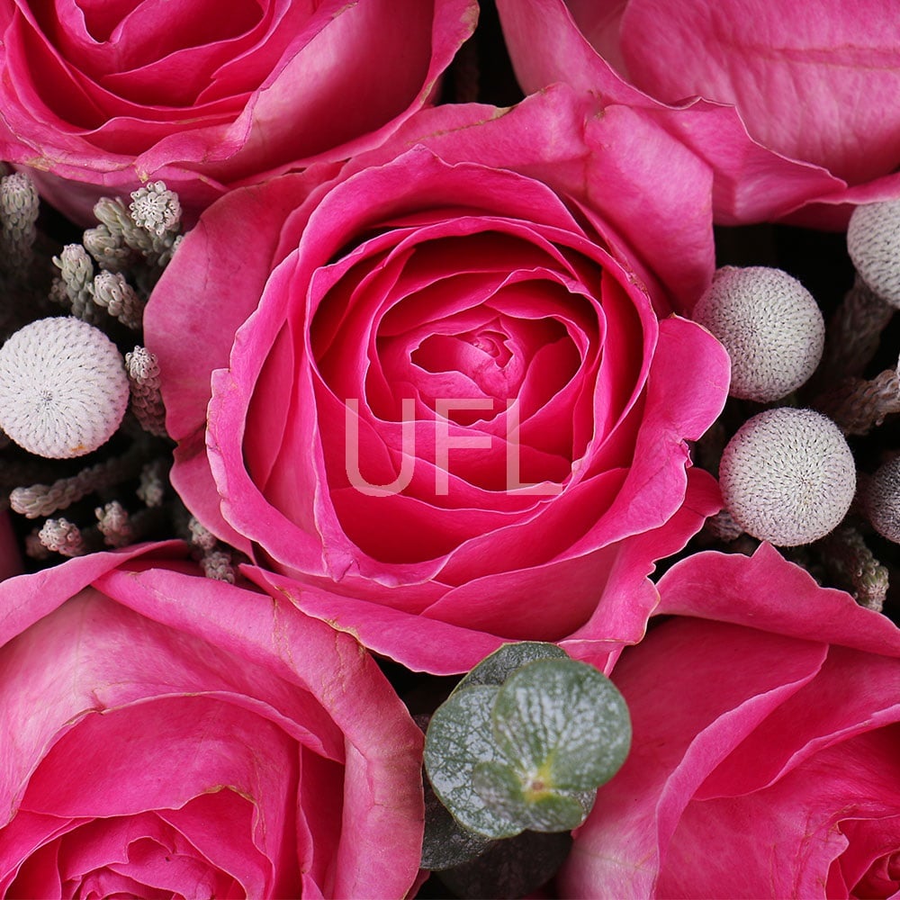• Состав: Эвкалипт (2 шт.) · Бруния · Оазис на цветы в коробке или композиции · Лента на цветы · Бант · Коробка круглая M · Роза Джумилия до 60 см (11 шт.)