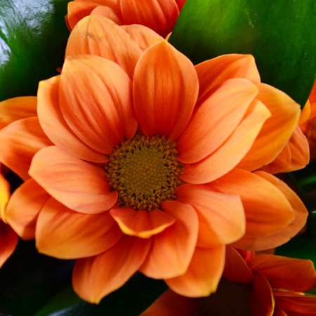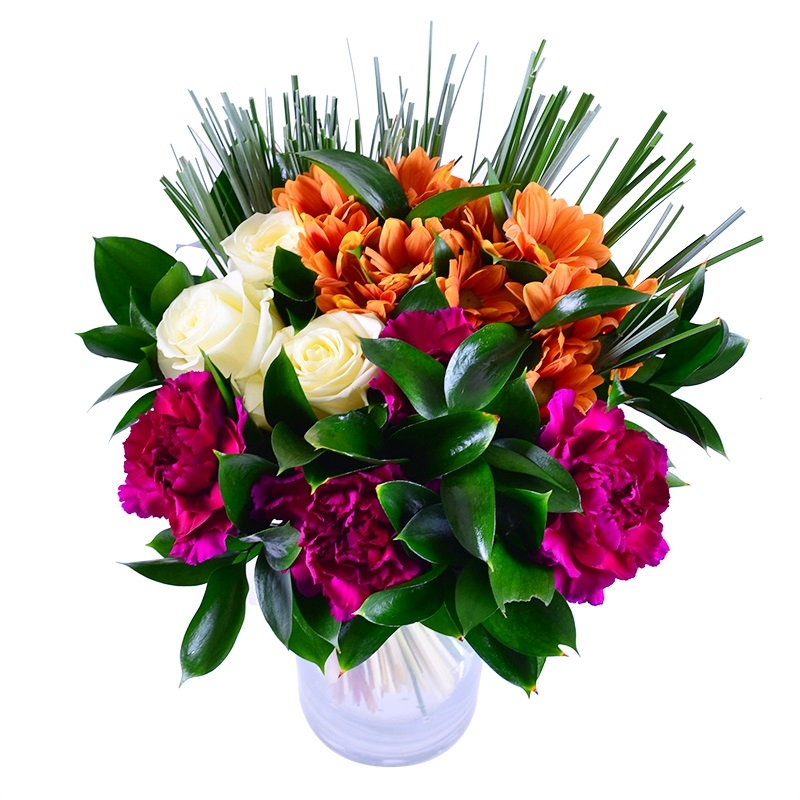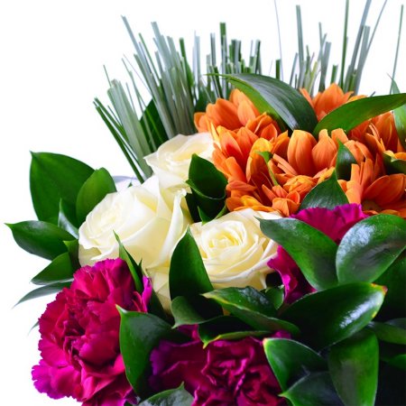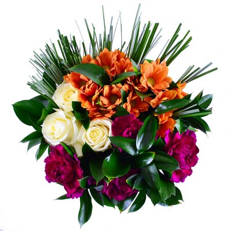 Удивительно красивый и оригинальный букет из бордовых гвоздик, белых роз, оранжевых хризантем с зеленью и тонкими веточками беарграсса. Сочные цвета композиции радуют глаз и дарят ощущение полноты жизни.