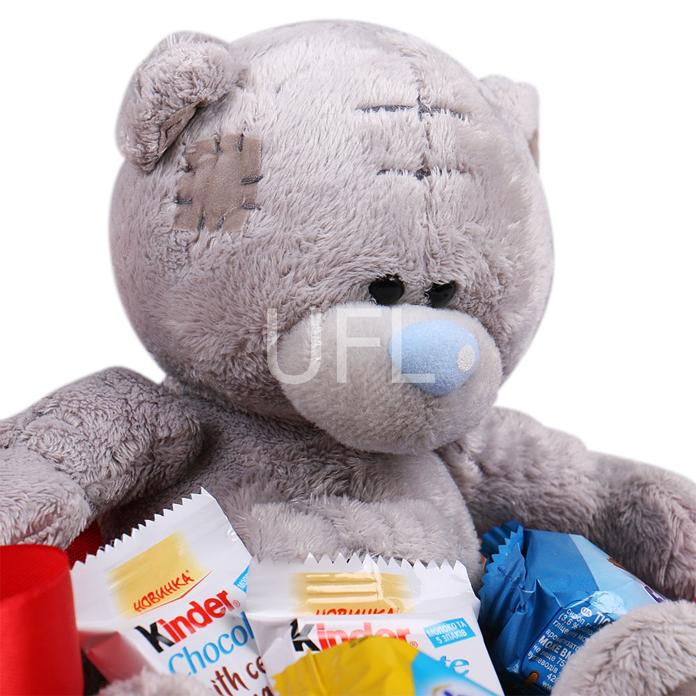 • Состав: Яйцо Kinder сюрприз (3 шт.) · Kinder chocolate 100 г (5 шт.) · Бант · Лента на цветы · Шоколад молочный Kinder Chocolate со злаками (2 шт.) · Игрушка Мишка Teddy 15 см · Бисквит Барни (5 шт.)